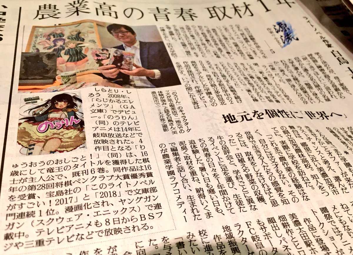 白鳥士郎 本日1月6日の読売新聞岐阜県版にて 地元出身作家として記事を載せていただいております 美濃加茂市の喫茶店で丁寧にご取材いただきました 岐阜が舞台の のうりん や らじかるエレメンツ のことはもちろん 8日からアニメが始まる